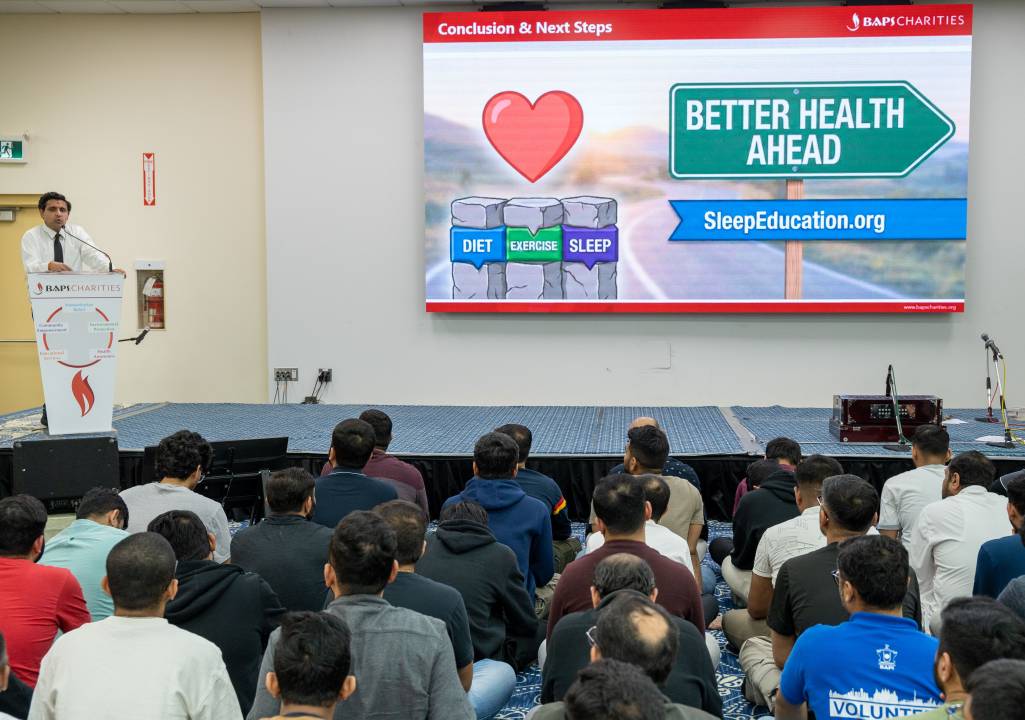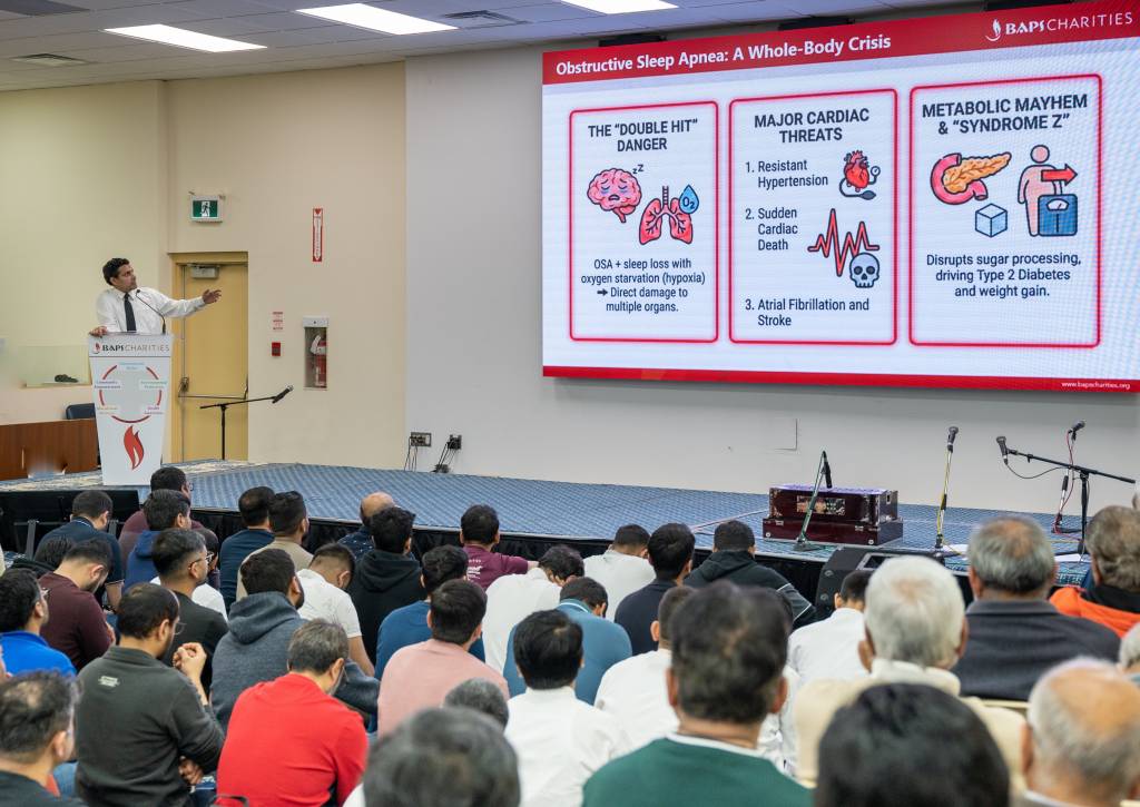 BAPS Charities hosted a health awareness lecture titled “Sleep and Heart Health” in Cambridge, on April 18, 2026. Nileshbhai Patel explained that sleep is equally important as diet and exercise. It is not simply a period of rest, but an active time when the body performs essential functions such as repairing tissues, clearing toxins, and allowing the heart to recover. During sleep, blood pressure naturally lowers, heart rate slows, and stress hormones decrease, giving the cardiovascular system an opportunity to reset and heal.