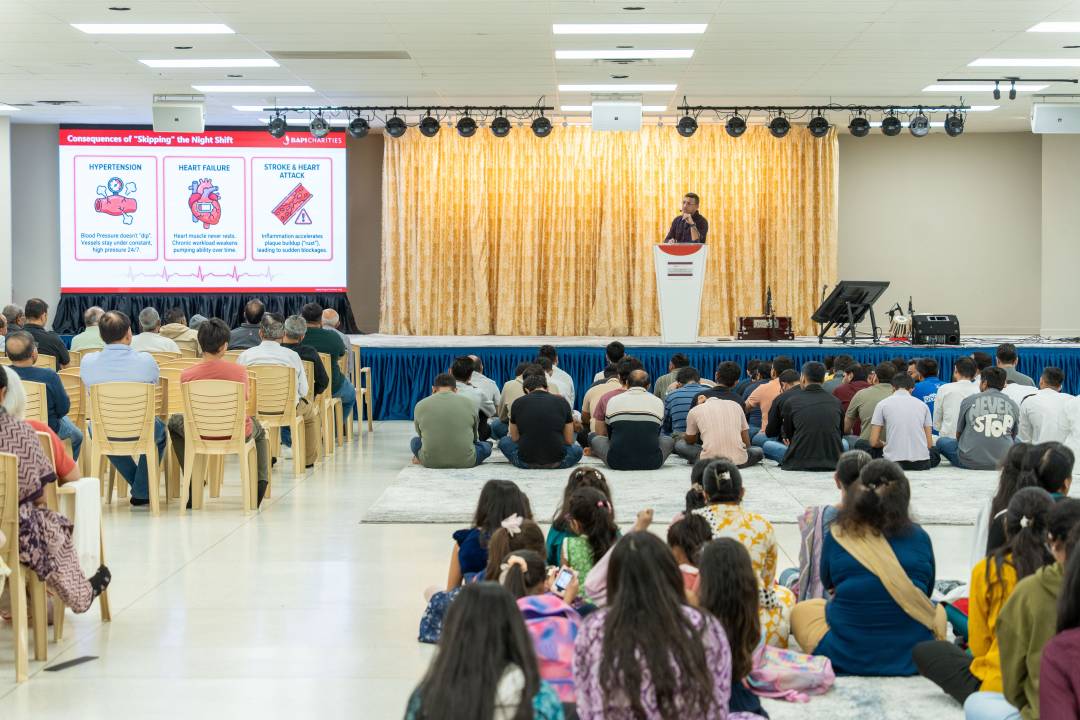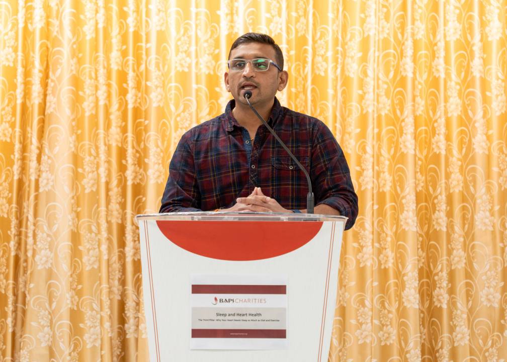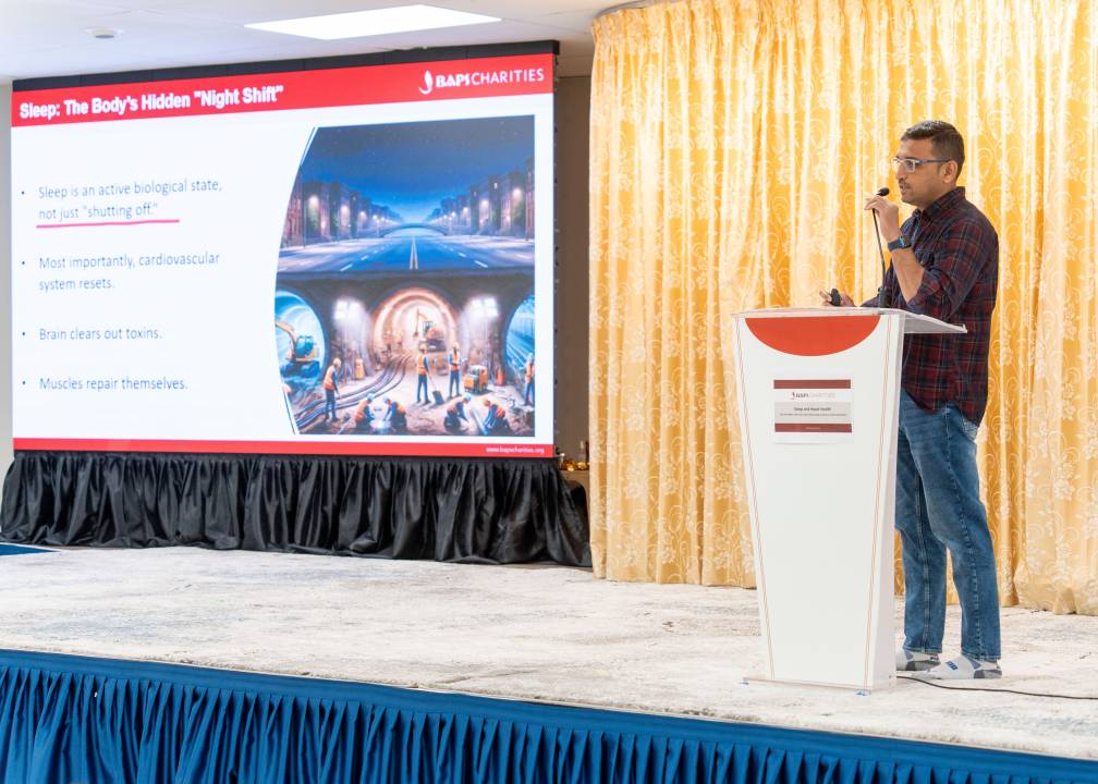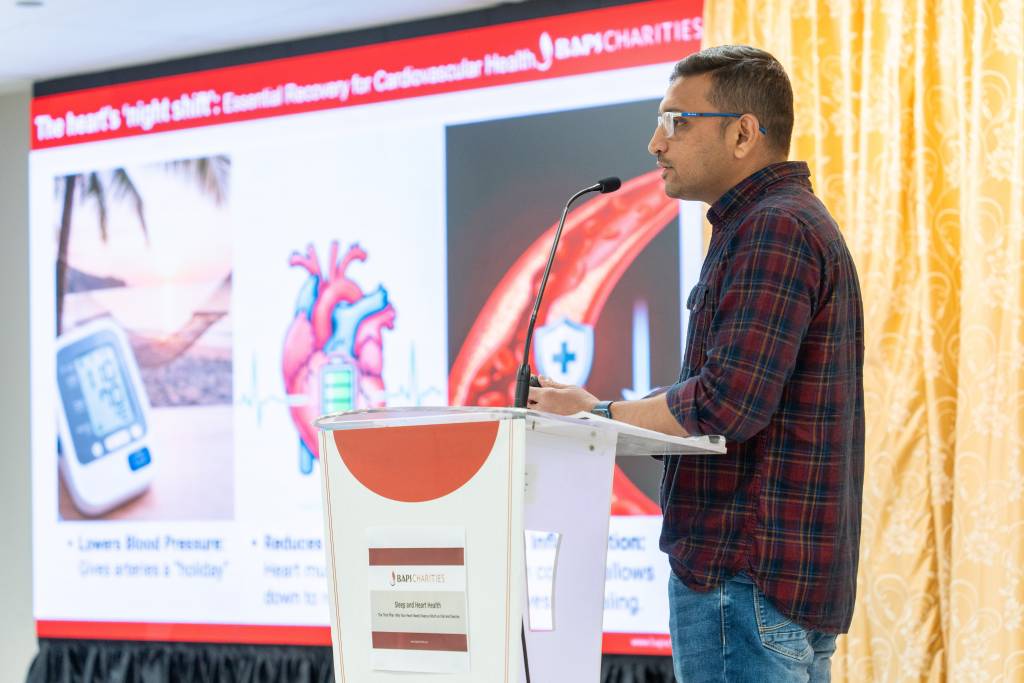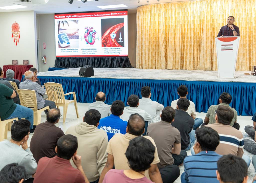 BAPS Charities hosted a health awareness lecture titled “Sleep and Heart Health” in Hamilton on April 26, 2026. Nilesh Patel explained that sleep is equally important as diet and exercise. It is not simply a period of rest, but an active time when the body performs essential functions such as repairing tissues, clearing toxins, and allowing the heart to recover. During sleep, blood pressure naturally lowers, heart rate slows, and stress hormones decrease, giving the cardiovascular system an opportunity to reset and heal.