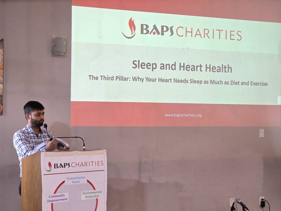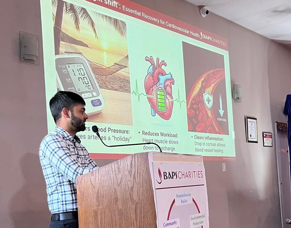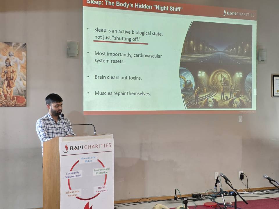 BAPS Charities hosted a health awareness lecture titled “Sleep and Heart Health” in Regina, on March 15, 2026. Jay Limbachiya explained that sleep is equally important as diet and exercise. It is not simply a period of rest, but an active time when the body performs essential functions such as repairing tissues, clearing toxins, and allowing the heart to recover. During sleep, blood pressure naturally lowers, heart rate slows, and stress hormones decrease, giving the cardiovascular system an opportunity to reset and heal.