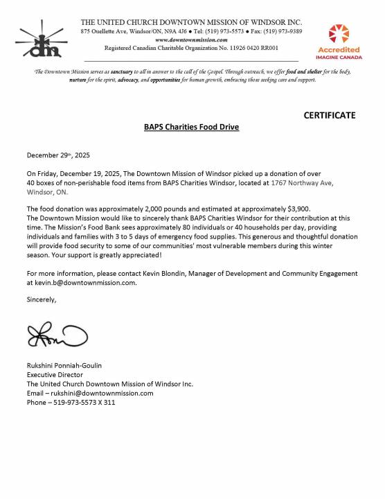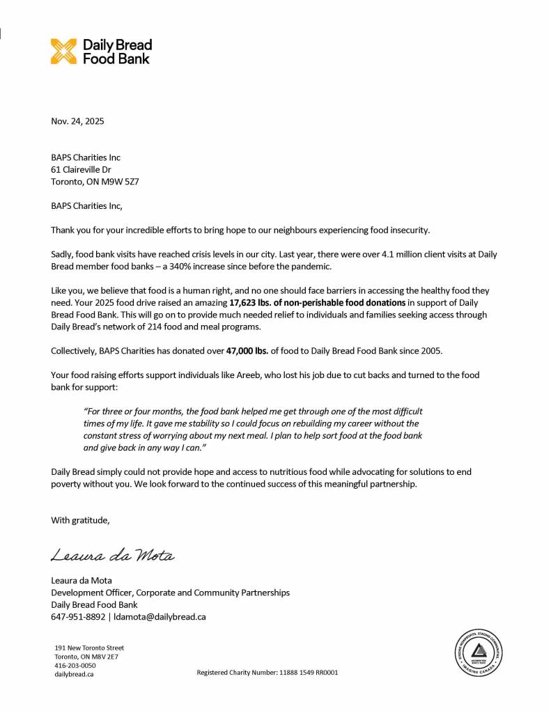 Councillor Vincent Crisanti, City of Toronto, posted on social media, “I always support community organizations that help secure food safety for people. Congratulations to BAPS Charities for organizing an event on November 14, 2025, to mark the conclusion of their nationwide food drive at the BAPS complex.…Hosted at 17 different BAPS Charities Centres across the country, this drive had the motto, ‘In the joy of others, lies our own’.”