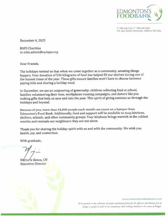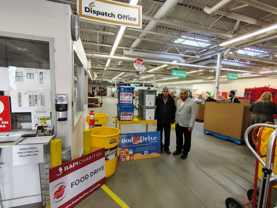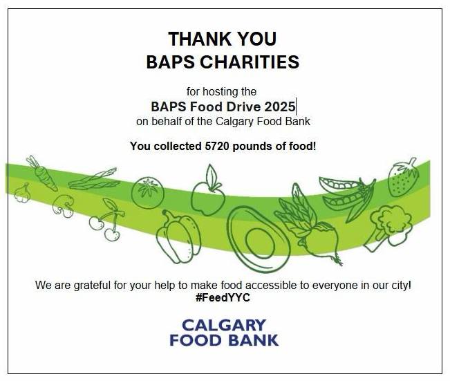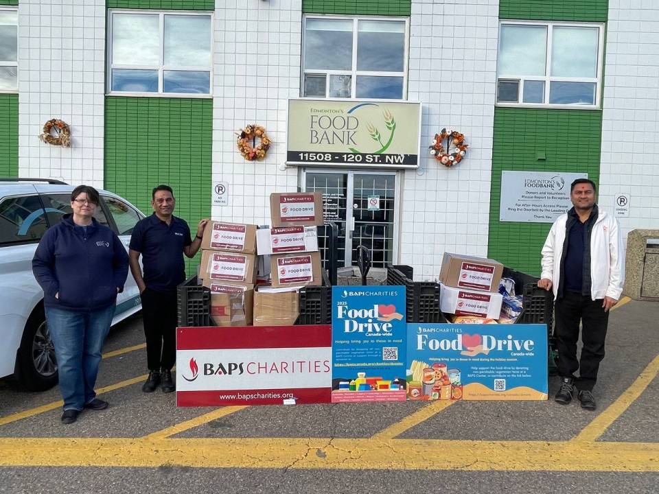 Edmonton’s Food Bank shared on social media, “BAPS Charities Edmonton conducted a food drive to coincide with Diwali and they raised over 1,000 pounds to help our community! Thank YOU to everyone who donated! We appreciate your support.”