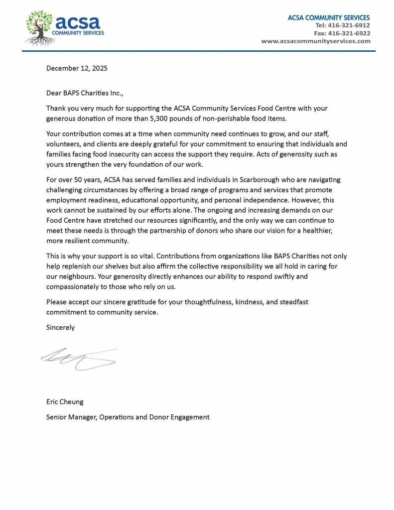 Councillor Michael Thompson, City of Toronto posted on social media, “Grateful to BAPS Charities for their generosity this holiday season! Together, we supported our community with a donation of 5 tonnes of non-perishable food to Agincourt Community Services Association (ACSA), helping families and individuals experiencing food insecurity this Christmas. We encourage other businesses and organizations to step up and give back. Your support can make a real difference in our community.”