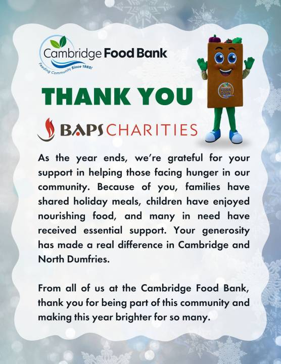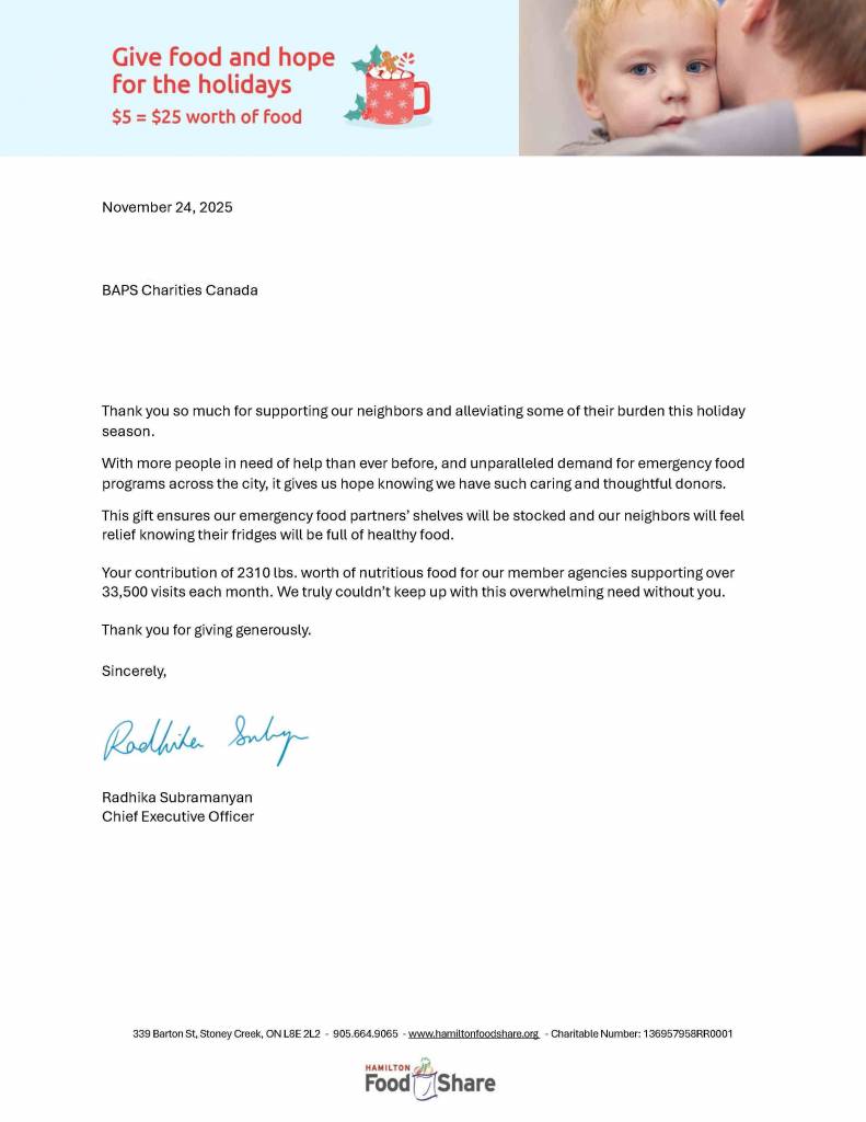 Yogesh Patel, President of BAPS Charities Canada, expressed gratitude for the collective efforts that made this nationwide initiative possible. “Through this food drive, we collectively committed to reaching out to the widest and most diverse communities across Canada, ensuring support reaches those most in need. This year, our volunteers truly went the extra mile, setting out to surpass last year’s collection of 43,000 pounds, and together we increased the total by over 23,000 pounds. This donation reflects the true spirit of service and unity that defines BAPS Charities. We sincerely thank our volunteers, especially the youth, our supporters, and our partners for their dedication and compassion. We also encourage all communities to continue supporting people in need or to join BAPS Charities in its ongoing efforts by supporting the many projects and initiatives that uplift and strengthen communities across the country.”