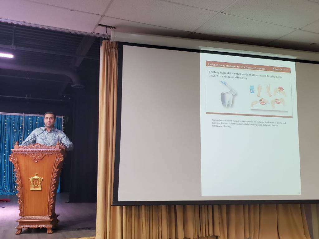 Dr. Priyang Chaudhari highlighted practical steps for prevention—brushing twice daily with fluoride toothpaste, flossing, using fluoride mouthwash, maintaining a balanced diet, and visiting a dentist regularly. Attendees also learned about choosing the right toothbrush and toothpaste, and how lifestyle factors such as smoking and poor nutrition impact dental health.